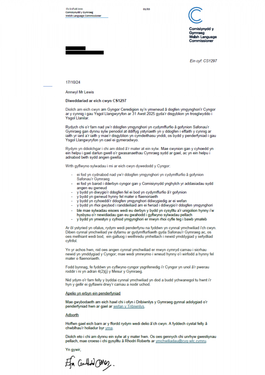 Mae llythyr y Comisiynydd at gadeirydd bwrdd lywodraethwyr Ysgol Llangwyrfon i'w weld isod.